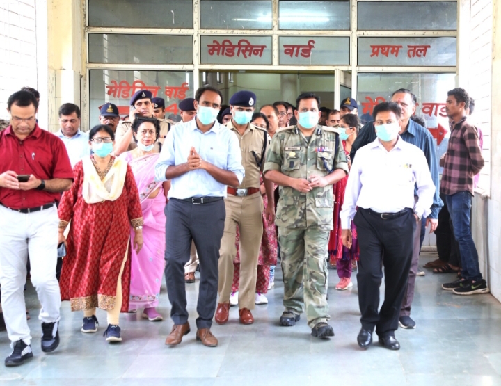 तथा संपूर्ण परिसर का भ्रमण किया। उन्होंने निरीक्षण के दौरान एंट्री एग्जिट गेट, सीसीटीवी फीड रूम, ओपीडी पंजीयन काउंटर, इमरजेंसी यूनिट, पार्किंग व्यवस्था, कन्या छात्रावास, पीजी तथा नर्सिंग बिल्डिंग, लाइब्रेरी, लेक्चर हॉल सहित संपूर्ण परिसर का भ्रमण किया। उन्होंने कहा कि जहां भी सीसीटीवी कैमरे की आवश्यकता है वहां तत्काल कैमरे लगाए जाएं एवं स्क्रीन फीड अधीक्षक कक्ष एवं अधिष्ठाता कक्ष में लगाई जावे। अग्नि दुर्घटना से बचाव के लिए अग्निशामक यंत्र लगाए जाएं एवं उन्हें समय-समय पर चेक भी किया जाए जिससे कि वह चालू स्थिति में रहे। उन्होंने कहा कि 24 घंटे विद्युत व्यवस्था की आपूर्ति बनी रहे इसके लिए जनरेटर के माध्यम से भी विद्युत आपूर्ति निर्बाध रूप से चालू रहे। एंट्री एग्जिट गेट सहित कन्या छात्रावास के मुख्य द्वार पर सीसीटीवी कैमरा लगवाने, रात्रि में सुरक्षा बढ़ाने, नाइट ड्यूटी करने वाले डॉक्टर्स के लिए मेल एवं फीमेल के अलग-अलग आईडेंटिफाई ड्यूटी रूम निश्चित करने, ड्यूटी रूम के बाहर सीसीटीवी कैमरे लगवाने के संबंध में निर्देश दिए। इसी प्रकार पीजी तथा नर्सिंग कॉलेज के रास्ते में हाई मास्क लाइट लगवाने के भी निर्देश दिए।