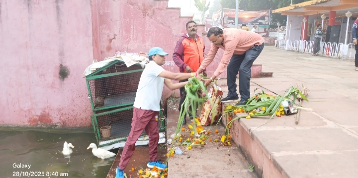 सागर । लाखा बंजारा झील किनारे चकराघाट पर आस्था और श्रद्धा के साथ स्वच्छता का समागम तब देखने मिला जब छठ पूजा का चार दिवसीय अनुष्ठान दिनांक 28 अक्टूबर को अपने समापन की ओर था मंगलवार की सुबह छठ व्रतियों द्वारा सूर्य पूजन के बाद नगर निगम आयुक्त सह कार्यकारी निदेशक एवं सीईओ सागर स्मार्ट सिटी राजकुमार खत्री की अगुवाई में सफाईमित्रों और स्थानीय नागरिकों ने मिलजुल कर छठ घाटों से फूल-पत्ती आदि विसर्जित सामग्री, फलों के छिलके सहित अन्य कचरा एकत्रित किया और कचरा गाड़ी के माध्यम से कचरा उठाकर 1 घंटे में झील के किनारे घाटों की सफाई सुनिश्चित की।