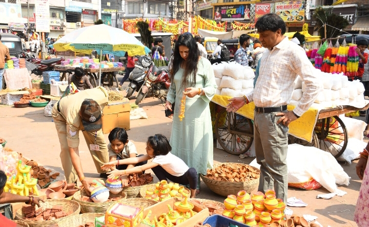 सागर । निगम आयुक्त राजकुमार खत्री ने धनतेरस के दिन सुबह सपरिवार कटरा बाजार पहुंचकर स्थानीय व्यापरीयों से स्वदेशी दीपक, सजावट एवं पूजन सामग्री आदि उत्पाद ख़रीदे। माननीय प्रधानमंत्री नरेंद्र मोदी के आवाहन पर आत्मनिर्भर भारत संकल्प अभियान ‘वोकल फॉर लोकल’ और स्वदेशी उत्पादों के उपयोग को बढ़ावा देने के लिए देशभर में कार्यक्रम आयोजित कर भारतीय नागरिकों और देशवासियों को स्वदेशी वस्तुओं की खरीदी बिक्री हेतु प्रोत्साहित व प्रेरित किया जा रहा है। इसी तारतम्य में निगमायुक्त श्री खत्री अपनी धर्मपत्नी एवं बच्चों सहित कटरा बाजार में दीपावली की खरीदी करने पहुँचे।