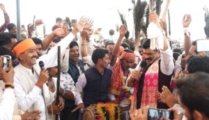 सागर । लंका के मैदान में अंगद रोके जांग रे, जांग हलाई ने हले,धरती हल हल जाए रे,, परंपरागत बुंदेली दिवारी गीत गाकर मंत्री गोविंद सिंह राजपूत मोनियो के साथ जैसीनगर के गोवर्धन मेला में जमकर झूमे।