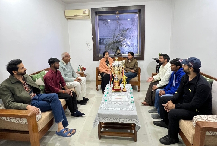इस ऐतिहासिक उपलब्धि के उपलक्ष्य में विजेता कलाकारों ने महापौर श्रीमती संगीता सुशील तिवारी से सौजन्य भेंट की।